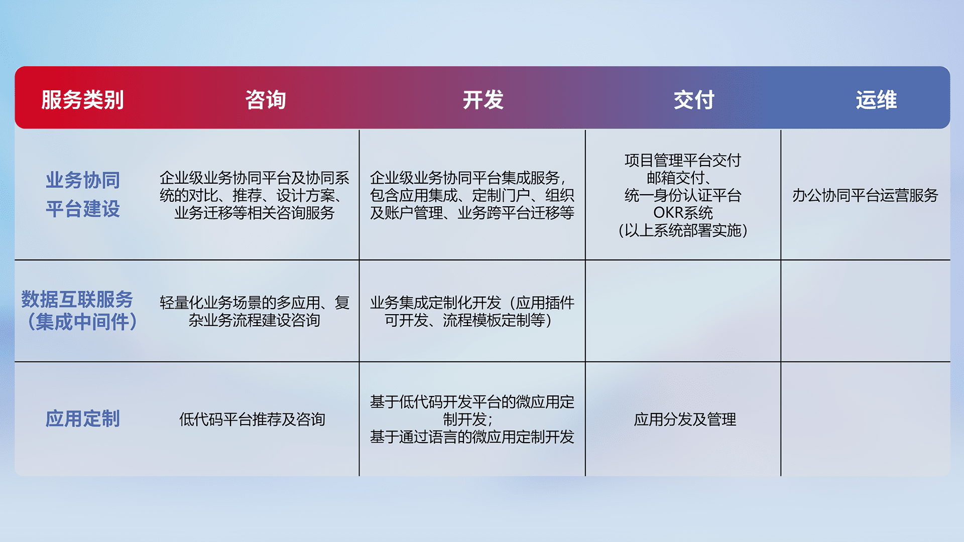 针对钉钉、、、、企微、、、IDaas等平台级产品提供产品的规划、、、、方案、、交付、、定制化开发等服务,,实现如统一协同办公、、、、智能客户服务、、、混合会议管理、、、、智能数据查询、、、、等业务场景,,,,实现数字化转型。。。。