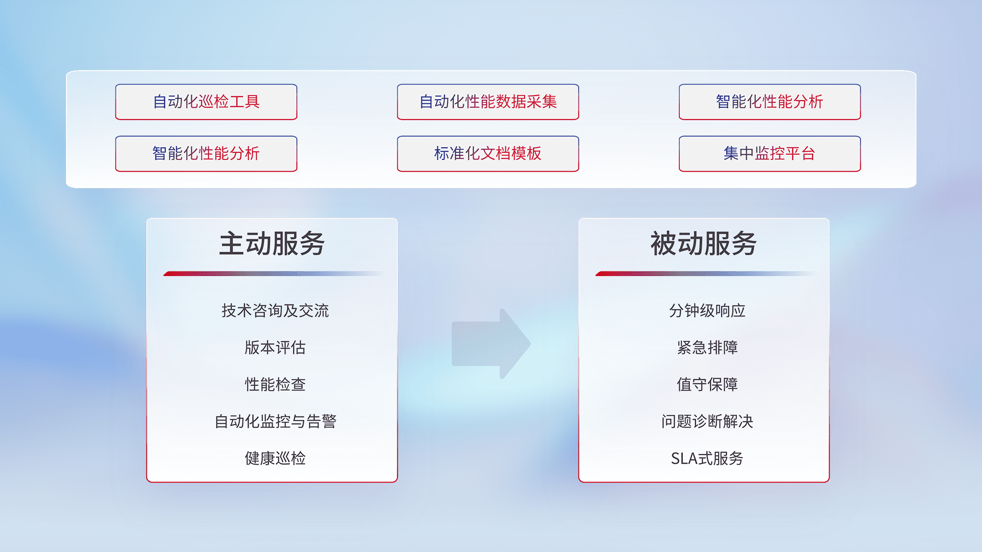 智能化工具和标准化文档,,,保障服务质量,,,提供主动服务(包含技术咨询、、版本评估、、性能检查、、自动化监控与告警、、、健康巡检)和被动服务包含(分钟级响应、、紧急排障、、值守保障、、、问题诊断解决、、、、SLA服务)。。。